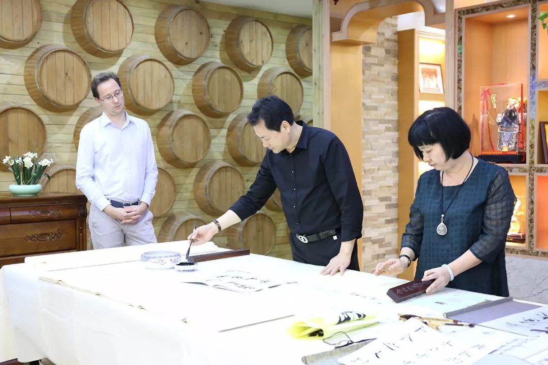圖為(wèi)吳董事(shì)長(cháng)以中國(guó)書(shū)法歡迎南(nán)部酒莊的(de)Jean-Baptiste VIDAL先生(shēng)