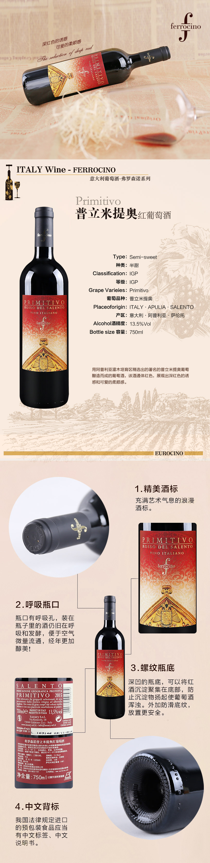品酒師(shī)品鑒:用(yòng)阿普利亞灌木(mù)培育區(qū)精選出的(de )著名的(de)普立米提奧葡萄釀造而成的(de)葡萄酒,該酒通(tōng)體(tǐ)紅(hóng)色,展現(xiàn)出深紅(hóng)色的(de)誘惑和(hé)可(k←ě)愛(ài)的(de)柔順感。